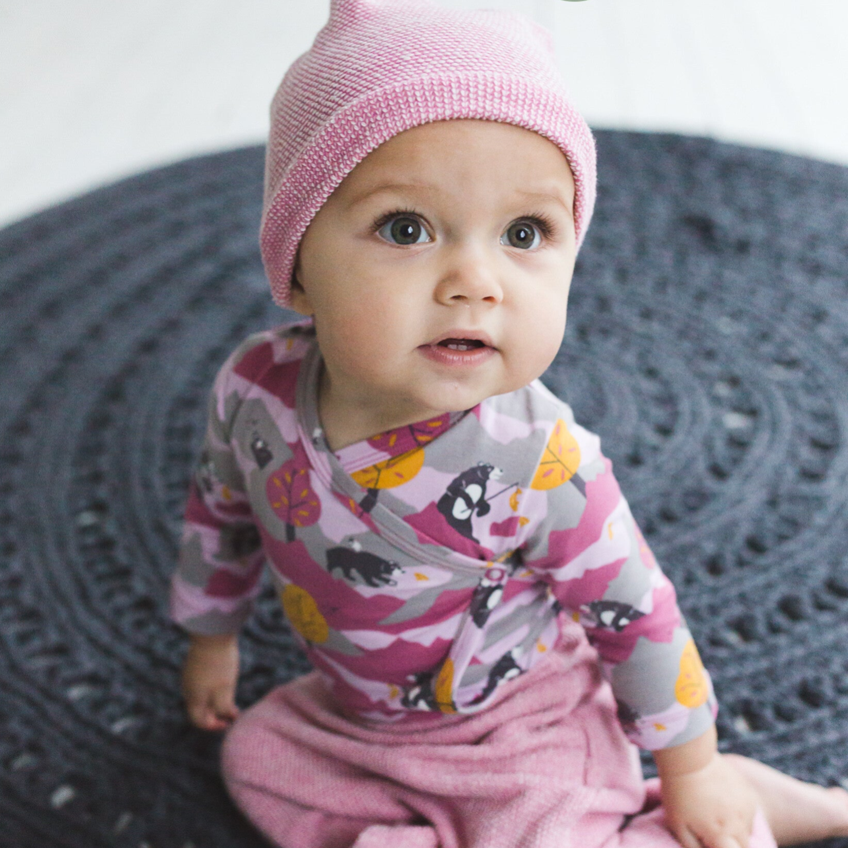 long sleeves kimono style body, rosa with print & knit rosa hat